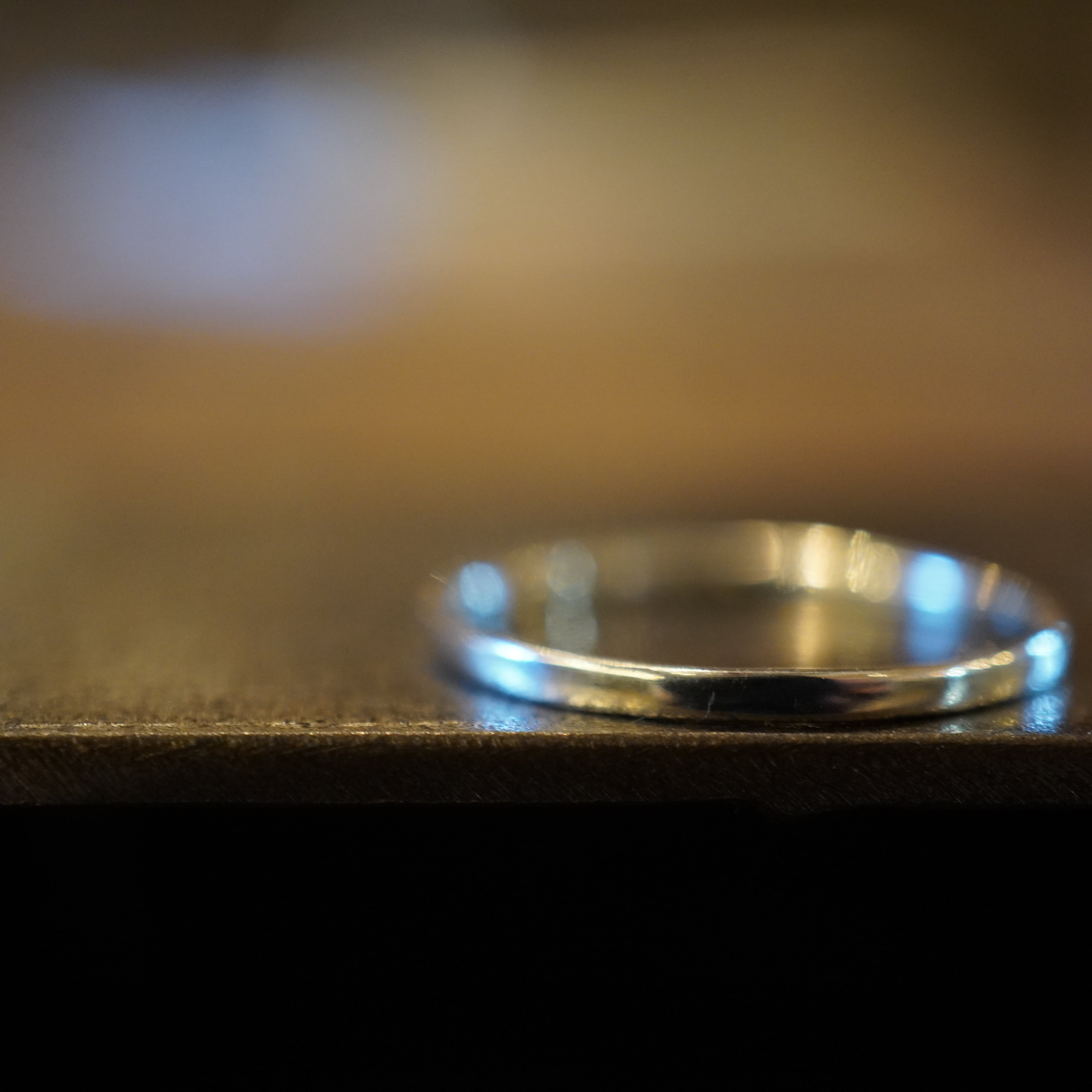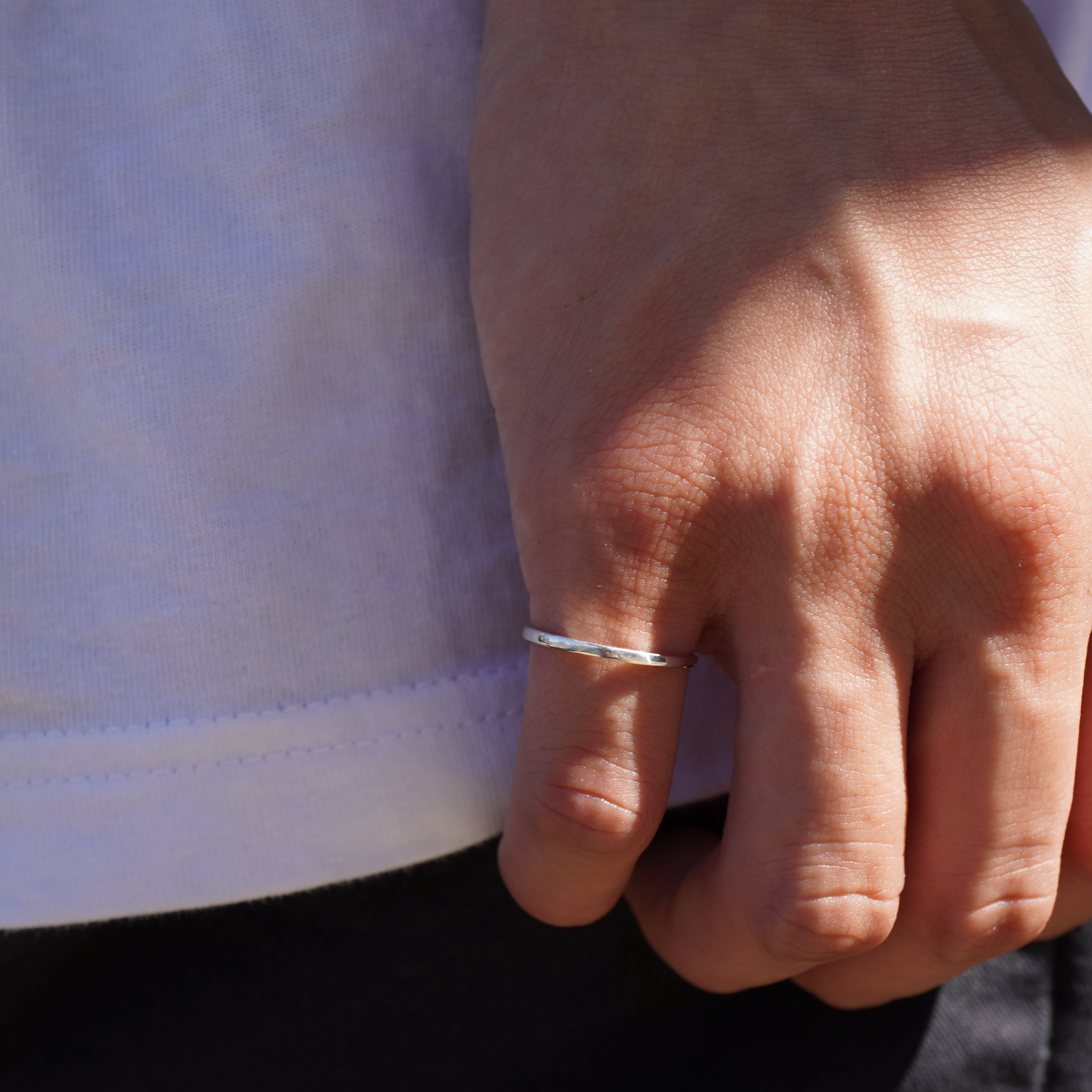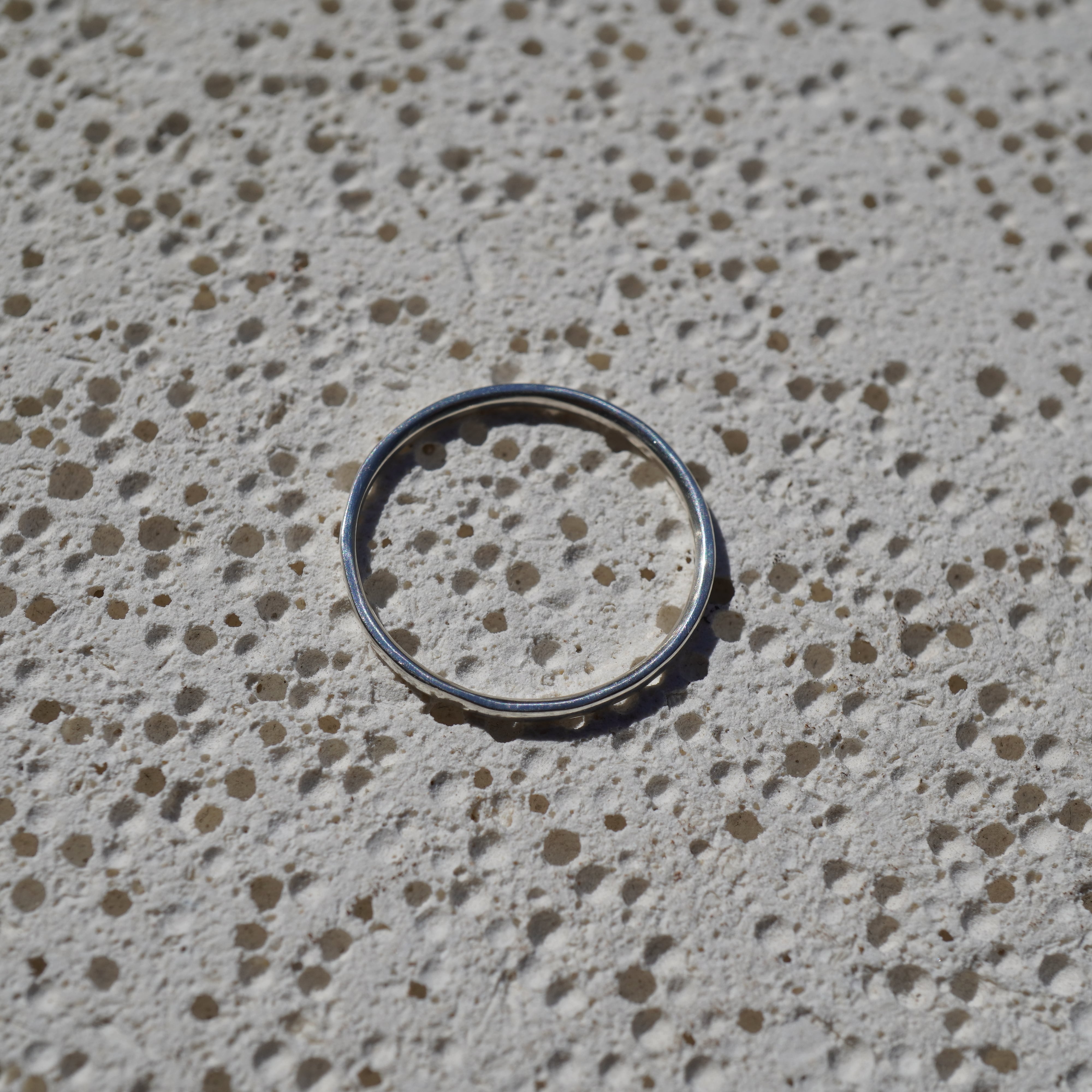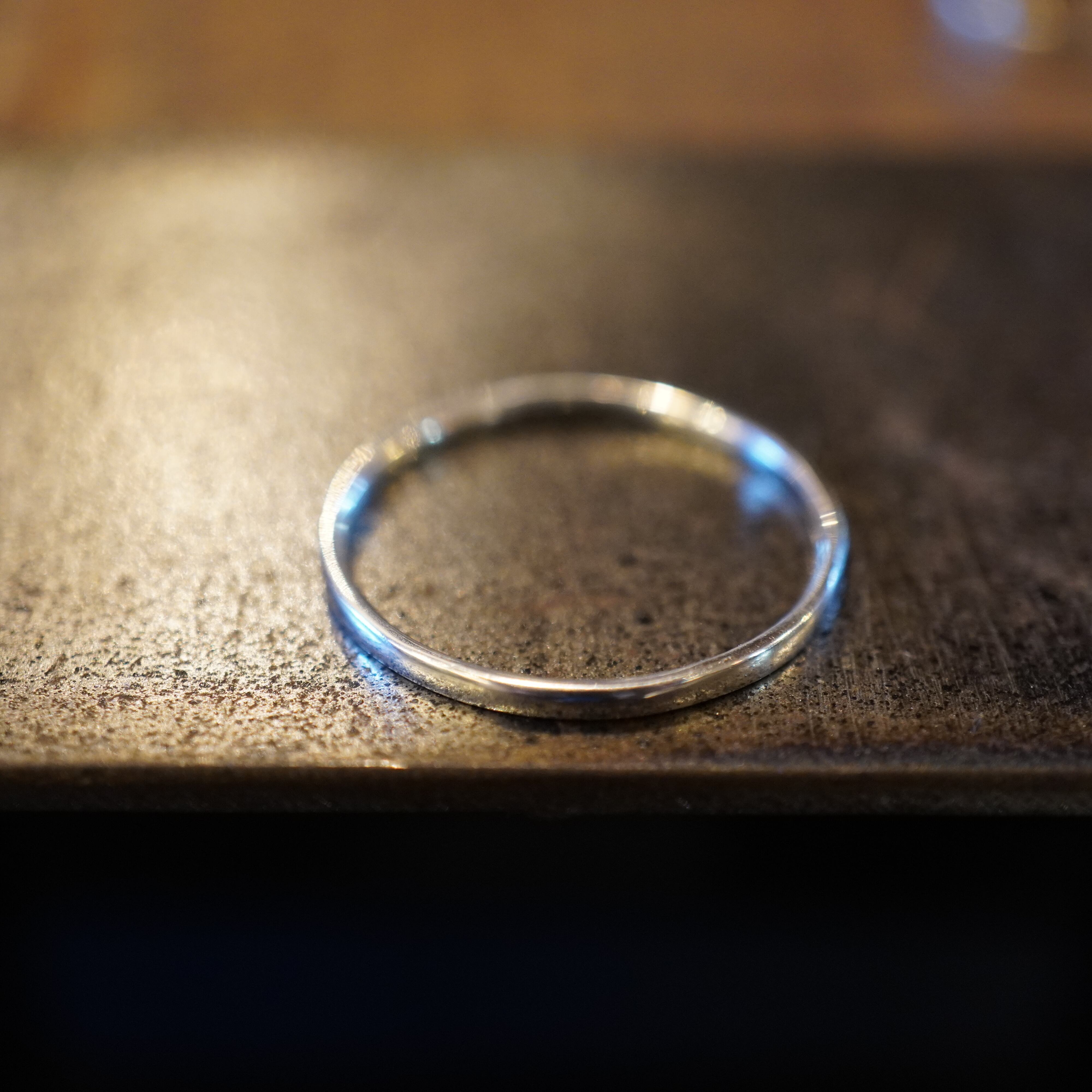1.5mm幅の極細平打ちリングは、指先をさりげなく彩る華奢デザイン。