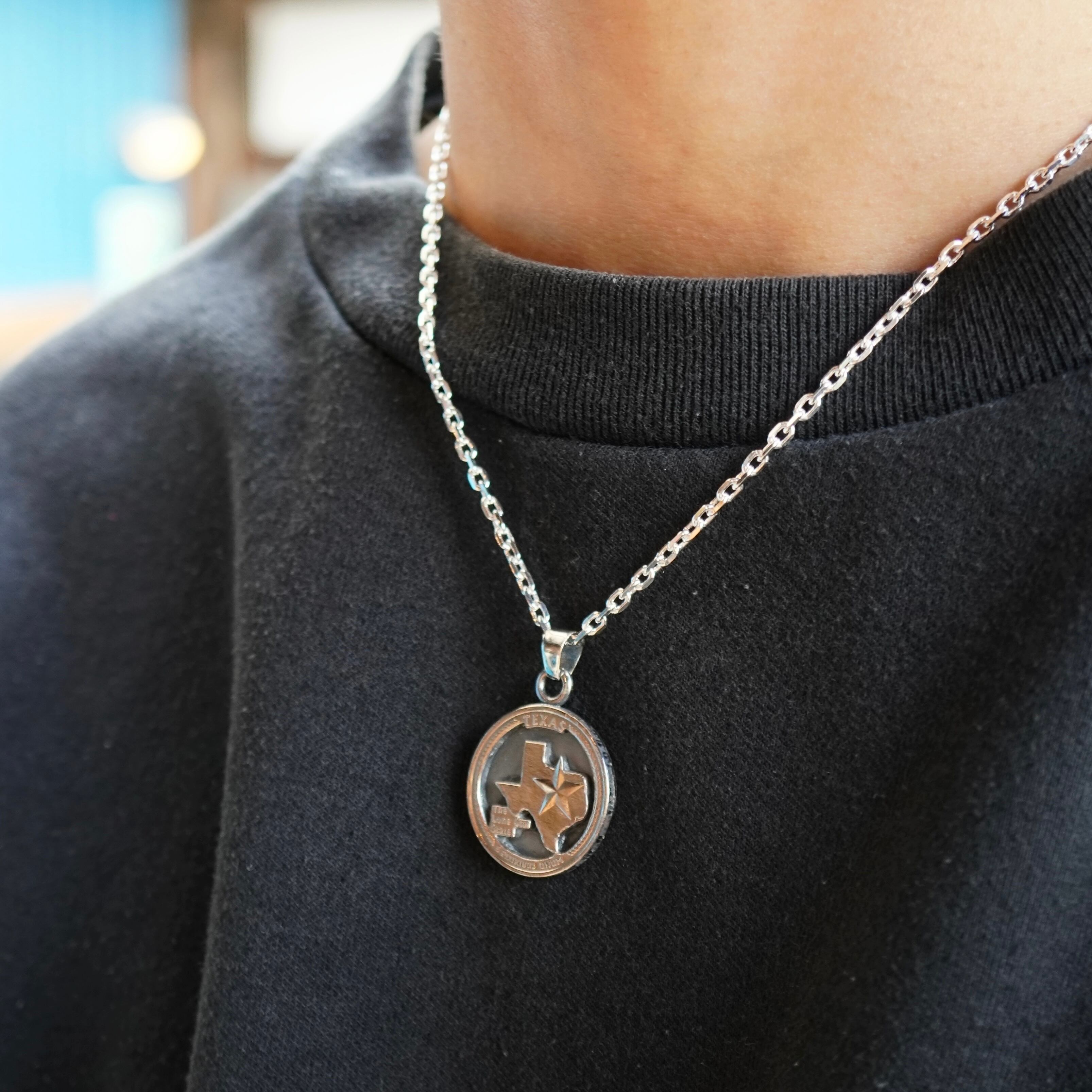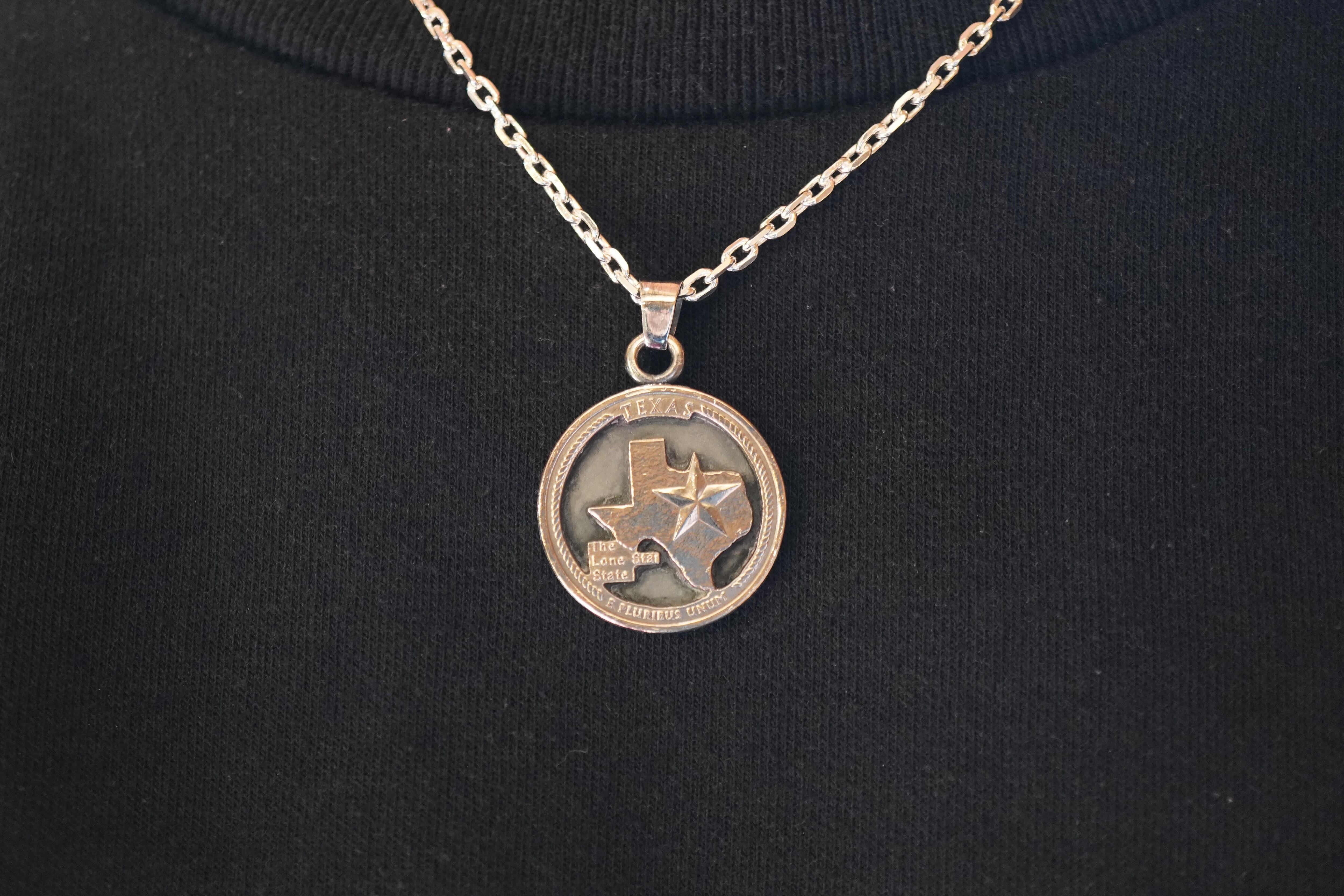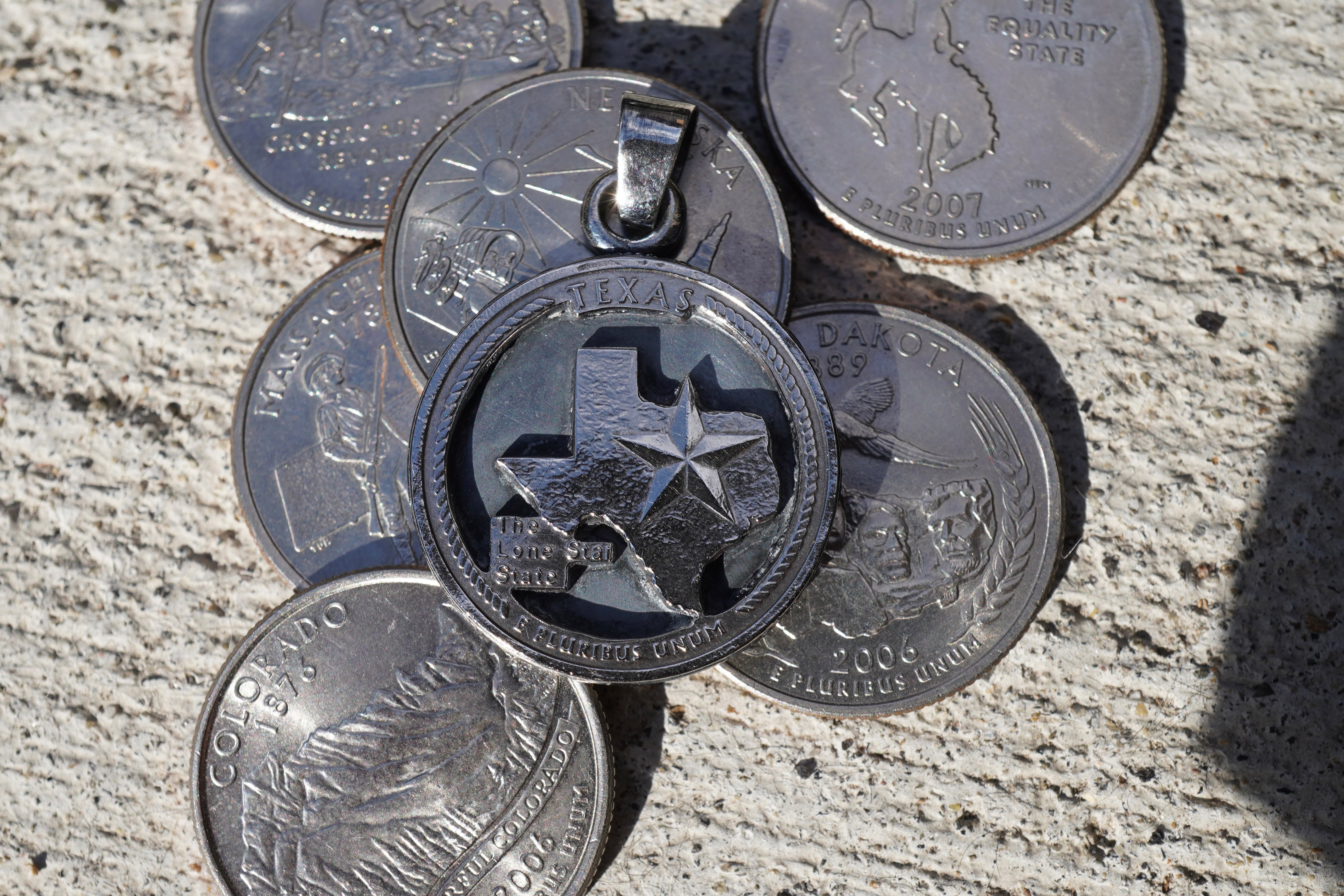 テキサス州の記念コインを立体的に仕上げたペンダントトップ。